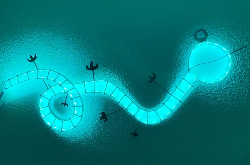 Materiales y técnica: pletina y alambre de acero trabajados a mano, tira de luz LED con interruptor y pintura para metal al agua.
